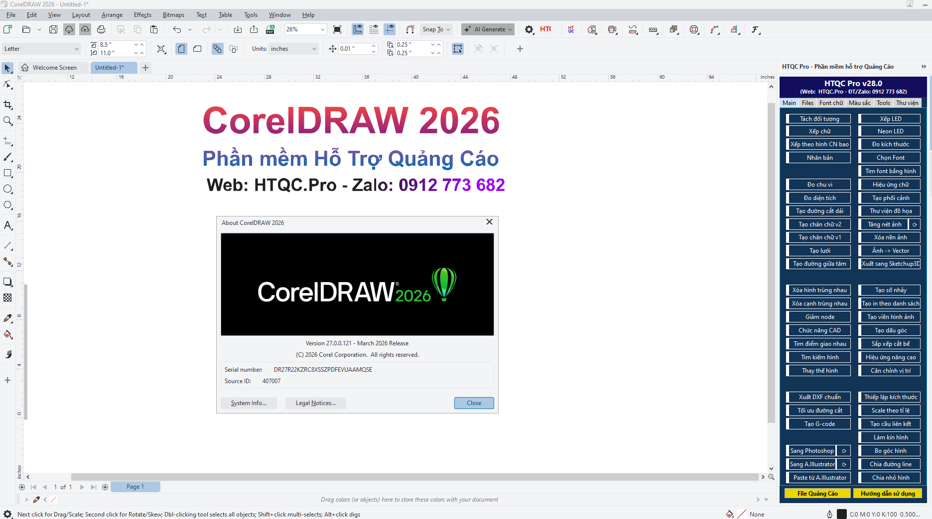 Sau đó tắt Corel, cài đặt phần mềm HTQC Pro và mở lại Corel để sử dụng.